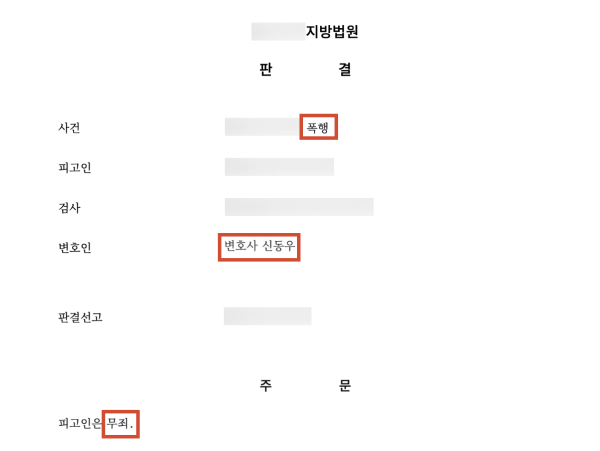 저는 CCTV 영상 분석을 통해 손이 피해자의 몸에 닿지도 않았고, 피해자의 반응 또한 폭행 상황과는 거리가 먼 점을 재판부에 상세히 설명했습니다. 피고인의 동작은 단순한 물건 가리킴일 뿐, 강제성이나 유형력 행사로 보기 어렵다는 점을 강조했습니다. 재판부는 이러한 주장과 영상자료를 근거로, 피고인의 행위가 폭행죄 구성요건에 해당하지 않는다고 판단해 무죄를 선고했습니다. 말 한마디, 손동작 하나로 억울한 피고인이 되는 일이 더 이상 반복되어선 안 됩니다. 저는 무고의 위험성과 싸우며, 억울한 분들을 위해 끝까지 싸우는 변호사입니다.