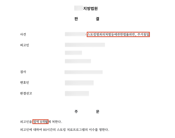 피해자는 사건 초기부터 극심한 불안 증세를 보였고, 피고인이 다시는 접근하지 못하도록 실질적인 법적 장치와 강력한 처벌을 원하셨습니다. 저는 피해자의 입장을 철저히 반영해 고소장을 구성했고, 피고인의 반복된 범행 양상과 누범 전력, 주거 침입이라는 중대한 행위를 중점적으로 강조했습니다. 특히 단순한 연락이 아닌 ‘물리적 접근과 위협’이 결합된 범행이라는 점에서 스토킹처벌법의 실효적 적용을 요청했고, 결국 법원은 징역 8개월의 실형과 함께 스토킹 치료 프로그램 이수 명령을 선고했습니다. 피해자 보호는 단순히 가해자를 처벌하는 것을 넘어, 향후 유사 범행의 재발을 방지하는 데까지 목표가 설정되어야 합니다. 합의 여부를 따지기에 앞서 처벌의 명확성을 확보한 뒤, 필요한 경우 보상 협상까지 병행하는 것이 저의 전략입니다.