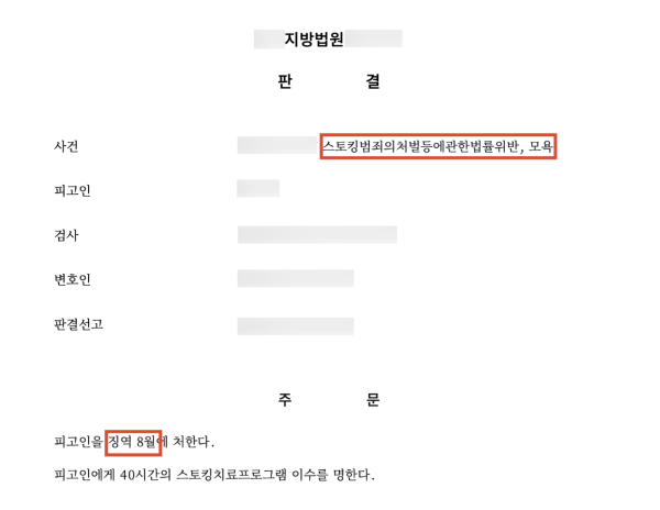 퇴직한 피해자에게까지 스토킹과 모욕을 이어간 사건 중 '징역 8개월 실형'이 선고된 사례