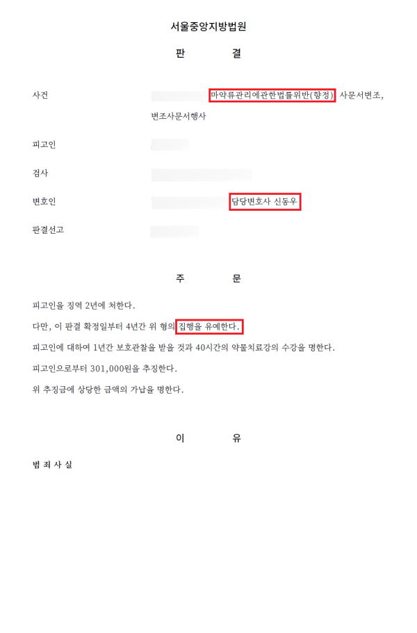 마약류관리법 위반으로 기소된 사건입니다. 초범이 아니어서 실형이 나올 수 있는 심각한 사안이었으며, 마약류관리법 이외에도 사문서변조, 변조사문서행사 등의 죄책을 함께 저지른 사건이었습니다.