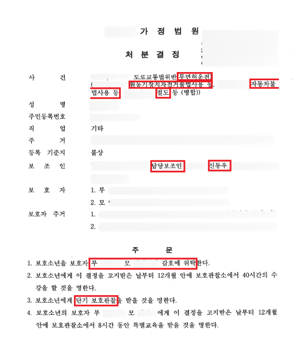 당시 보호소년의 가정환경, 정신과 진료 기록, 사후조치, 피해자와의 합의 등을 적극적으로 어필하여 최소한의 처분을 받아낼 수 있었습니다.