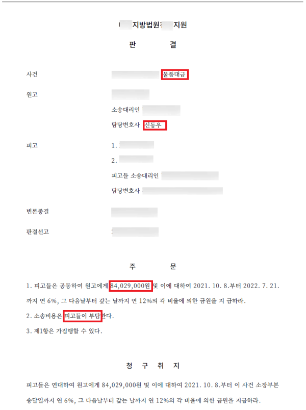 원고는 충분히 a/s 의무를 이행하였다는 점을 입증함과 동시에 피고들이 부당하게 a/s나 물품 지급 시기 등에 관하여 허위 주장을 하고 있다는 점을 강조하였고, 그 결과 청구금액 전부를 인정받을 수 있었습니다.