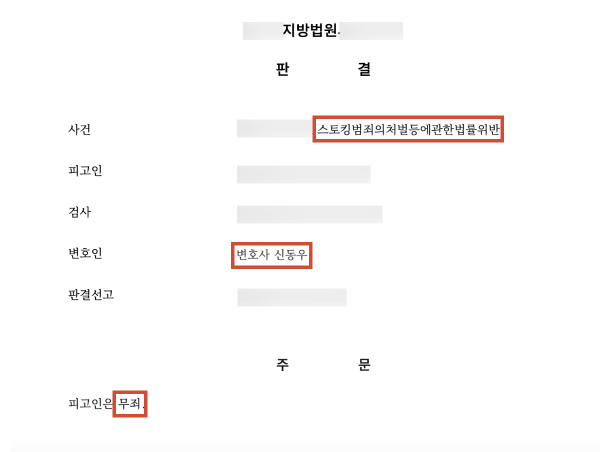 저는 초기에 피고인이 상대방과의 합의를 위해 연락한 것이며, 이전에 상대방이 먼저 연락한 이력도 있어 대화 가능성에 대한 기대가 있었음을 강조했습니다. 수사 및 재판 과정에서 문자 내용이 위협적이지 않았고, 연락 간의 시간 간격도 짧지 않았다는 점, 연락 횟수 또한 극단적으로 많지 않았다는 점을 근거로 들어, 고의성과 지속성을 부정했습니다. 재판부 역시 이러한 논리를 받아들여, 피고인의 행위가 상대방에게 공포심을 유발할 만큼 반복적이거나 집요하지 않았다고 보아 무죄를 선고했습니다. 이 사건은 누군가의 감정과 해석만으로도 억울한 스토킹 고소가 이루어질 수 있다는 점을 여실히 보여줍니다. 저는 앞으로도 이런 무고의 위험성과 싸우며, 억울한 사람들을 위해 끝까지 싸우는 변호사로 남겠습니다.